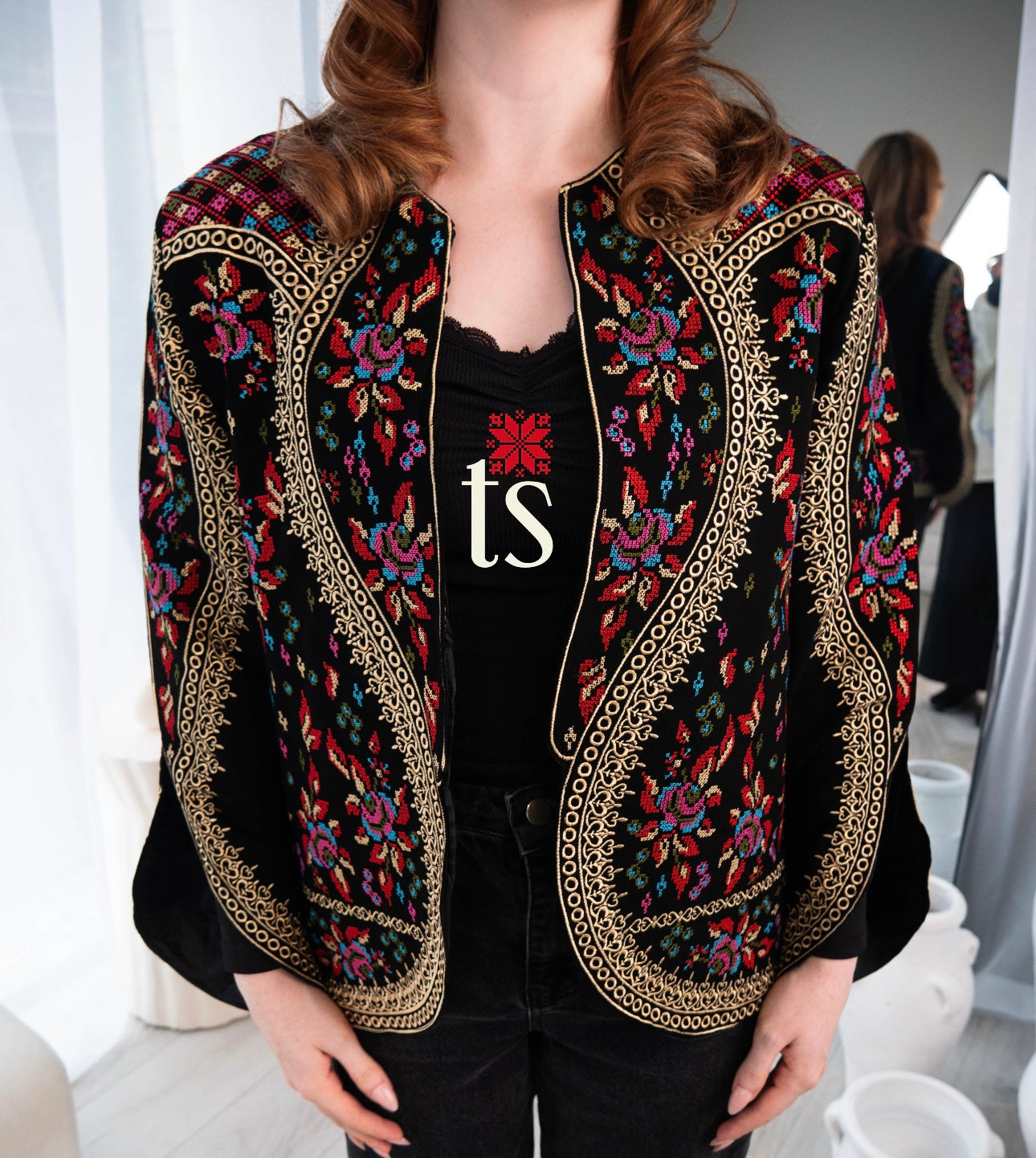 Detailed Tatreez on the front and subtle Tatreez on the back.