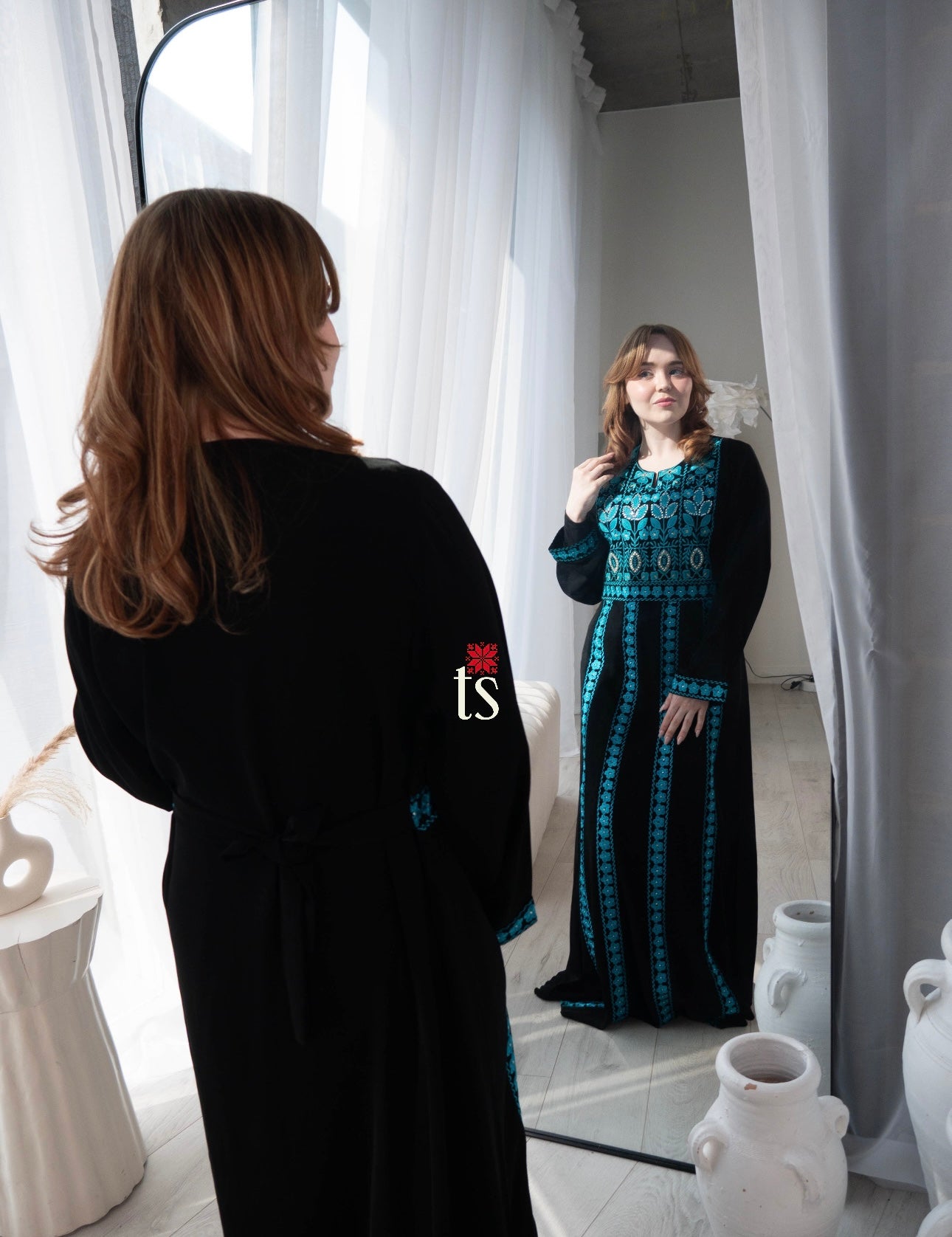 The Flower Embroidered Thobe in ocean blue has a tie back belt and can be adjusted as you wish!